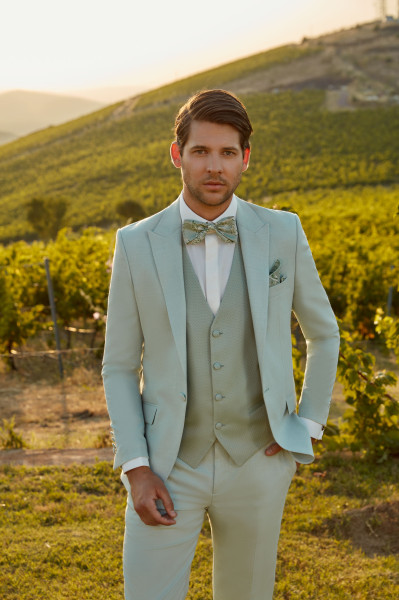 La boutique nuptiale NUPTIAE CREATIONS propose le costume de mariage pour homme trois pièces bleu marine près de Roanne pour habiller les futurs mariés.
